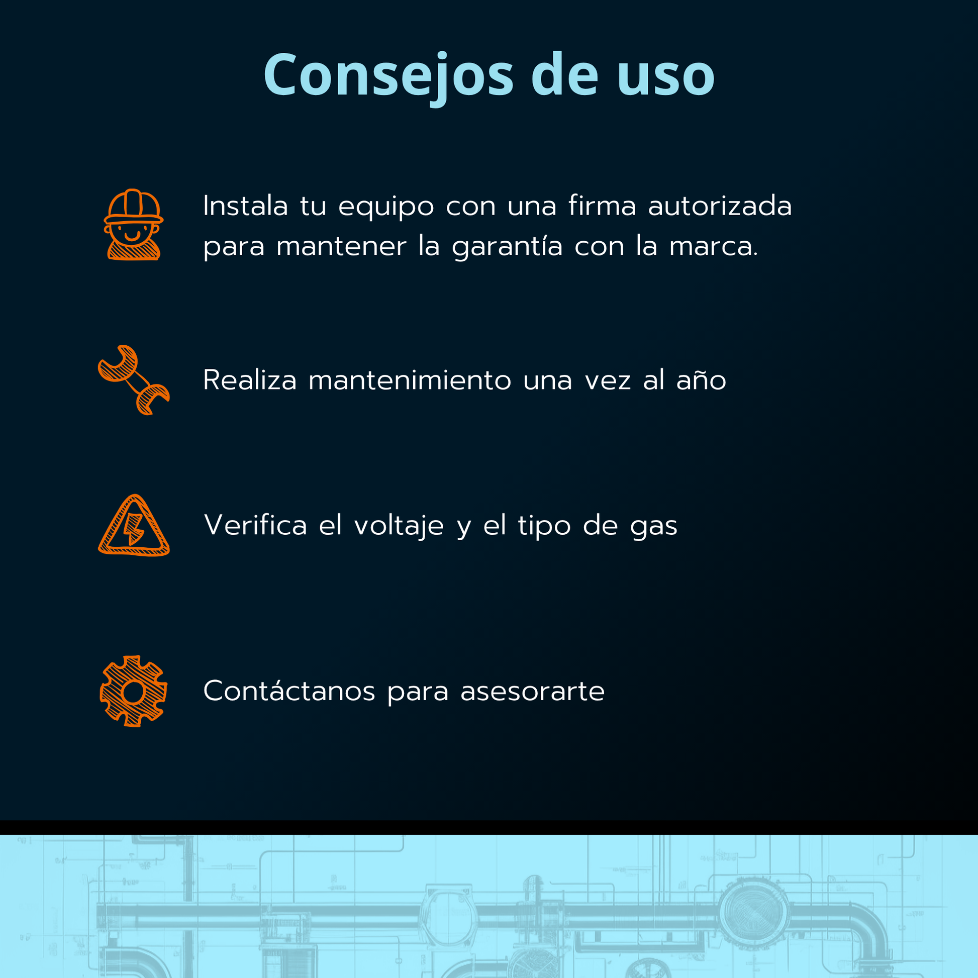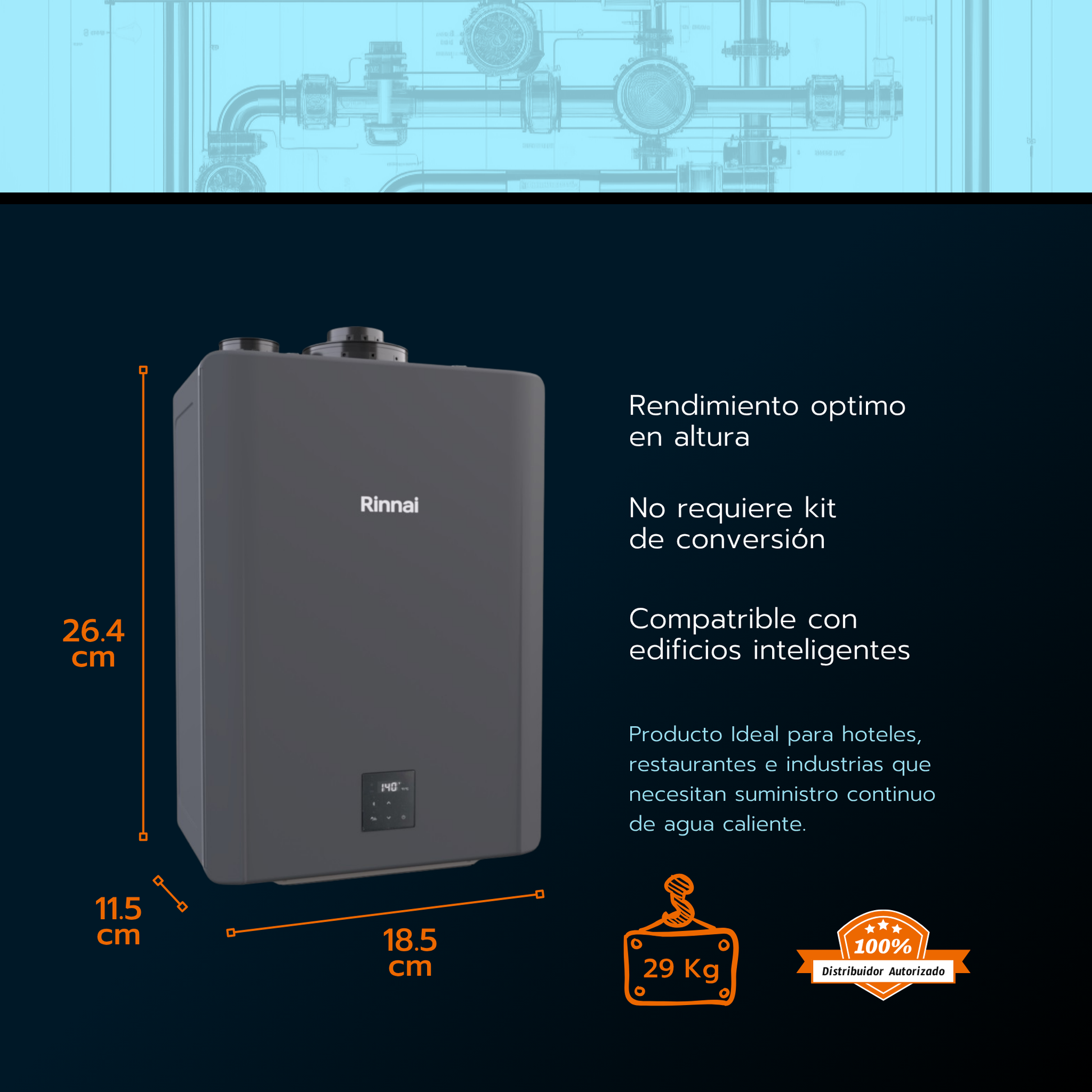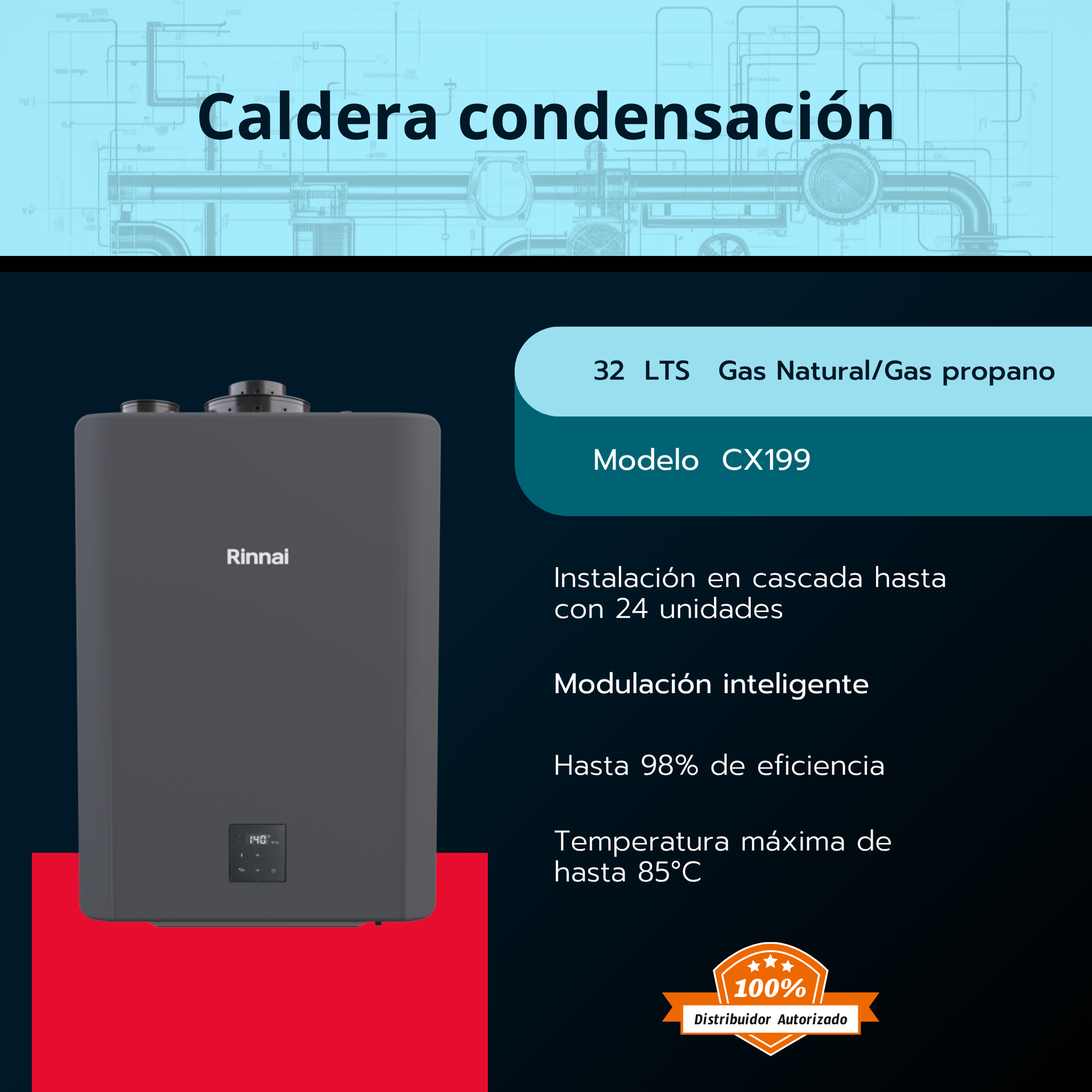 La caldera mural Rinnai CX199 es una solución de alta eficiencia diseñada para satisfacer las demandas de agua caliente en comercios y grandes instalaciones, ofreciendo un suministro continuo con un 98% de eficiencia. Su tecnología de condensación aprovecha al máximo el calor de los gases de combustión, reduciendo el consumo de gas, mientras que el sistema Smart Sense ajusta automáticamente el flujo y la presión para un rendimiento óptimo. Su diseño compacto permite una instalación versátil en interiores o exteriores, es compatible con gas natural o propano, y puede conectarse en cascada hasta 24 unidades, adaptándose a las necesidades de agua caliente de establecimientos de cualquier tamaño.