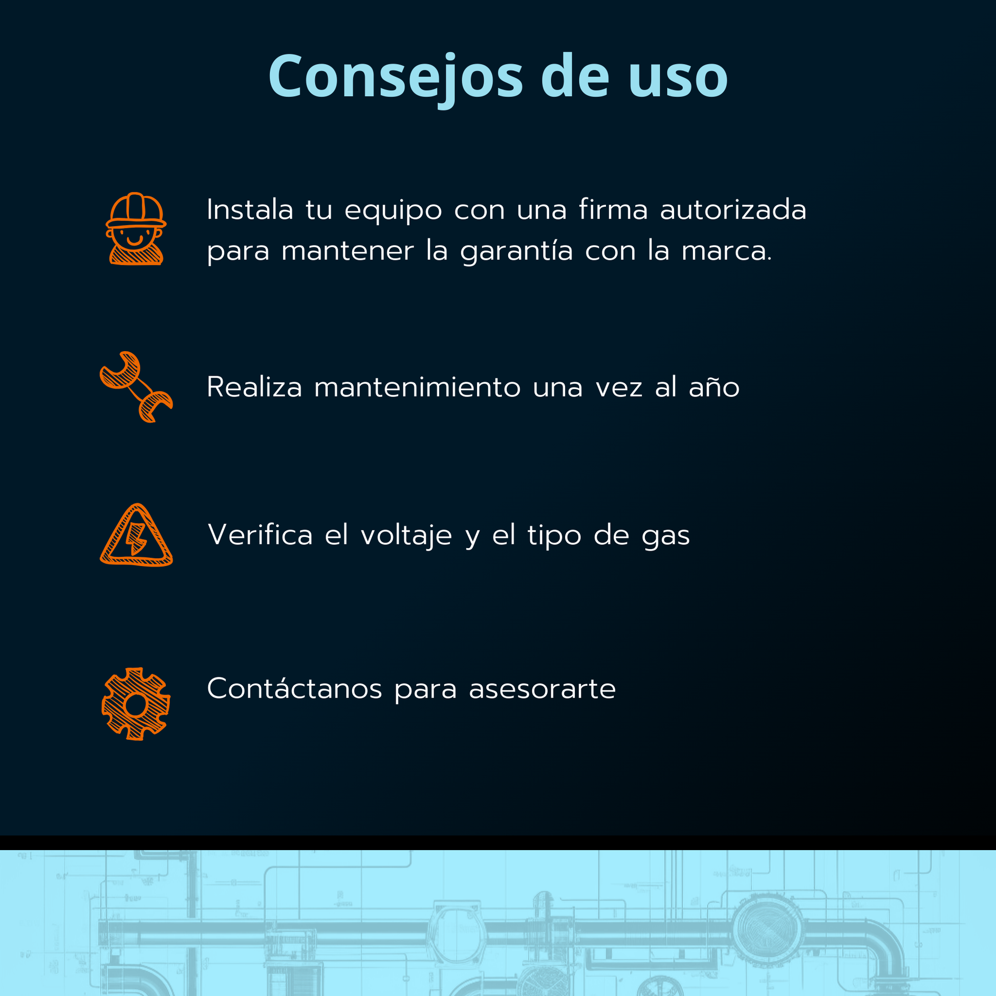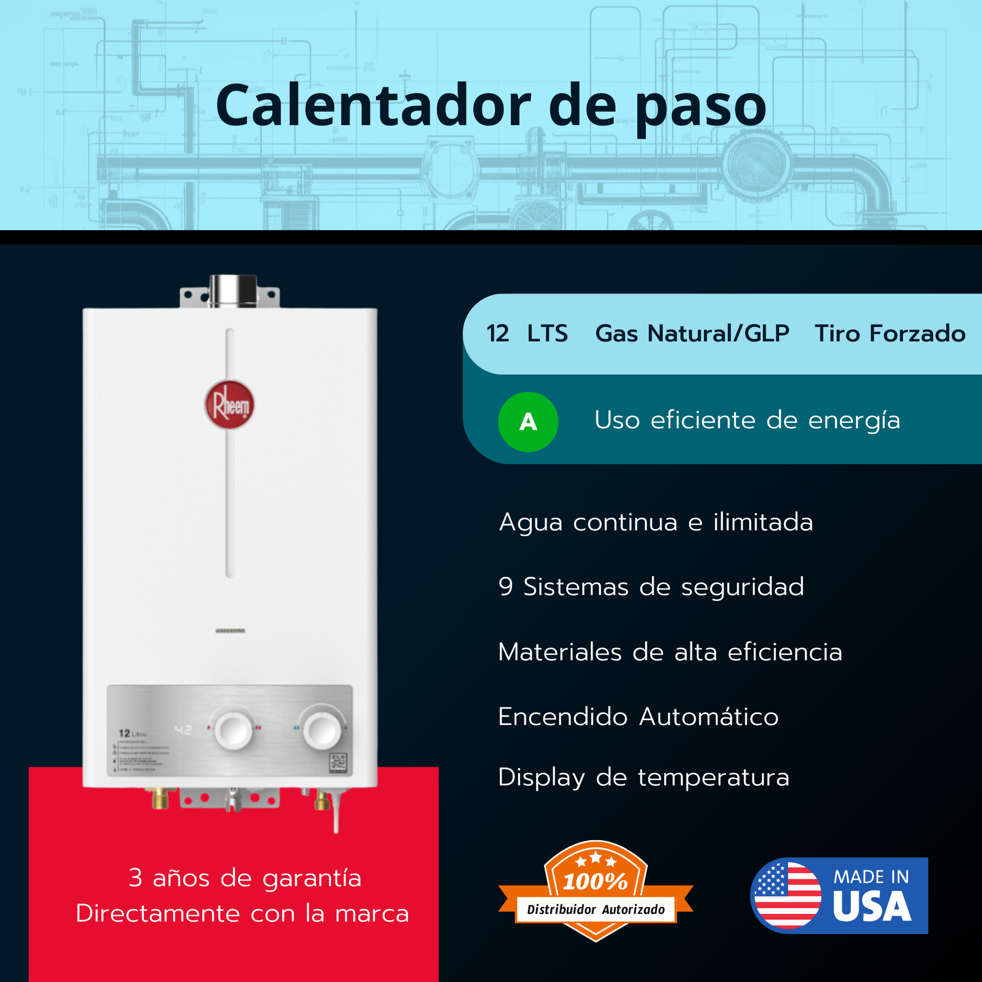 Disfruta ahora de un baño de agua caliente al instante sin límite con el Calentador de Paso 12 litros tiro forzado Mecánico. Diseñado con altos estándares de calidad, 7 sistemas de seguridad y una cámara de combustión 100% de cobre para una larga durabilidad. ¿Quieres más? Ofrece control manual fácil de usar, encendido automático y un moderno display de temperatura. ¡Ahorra energía sin perder comodidad!